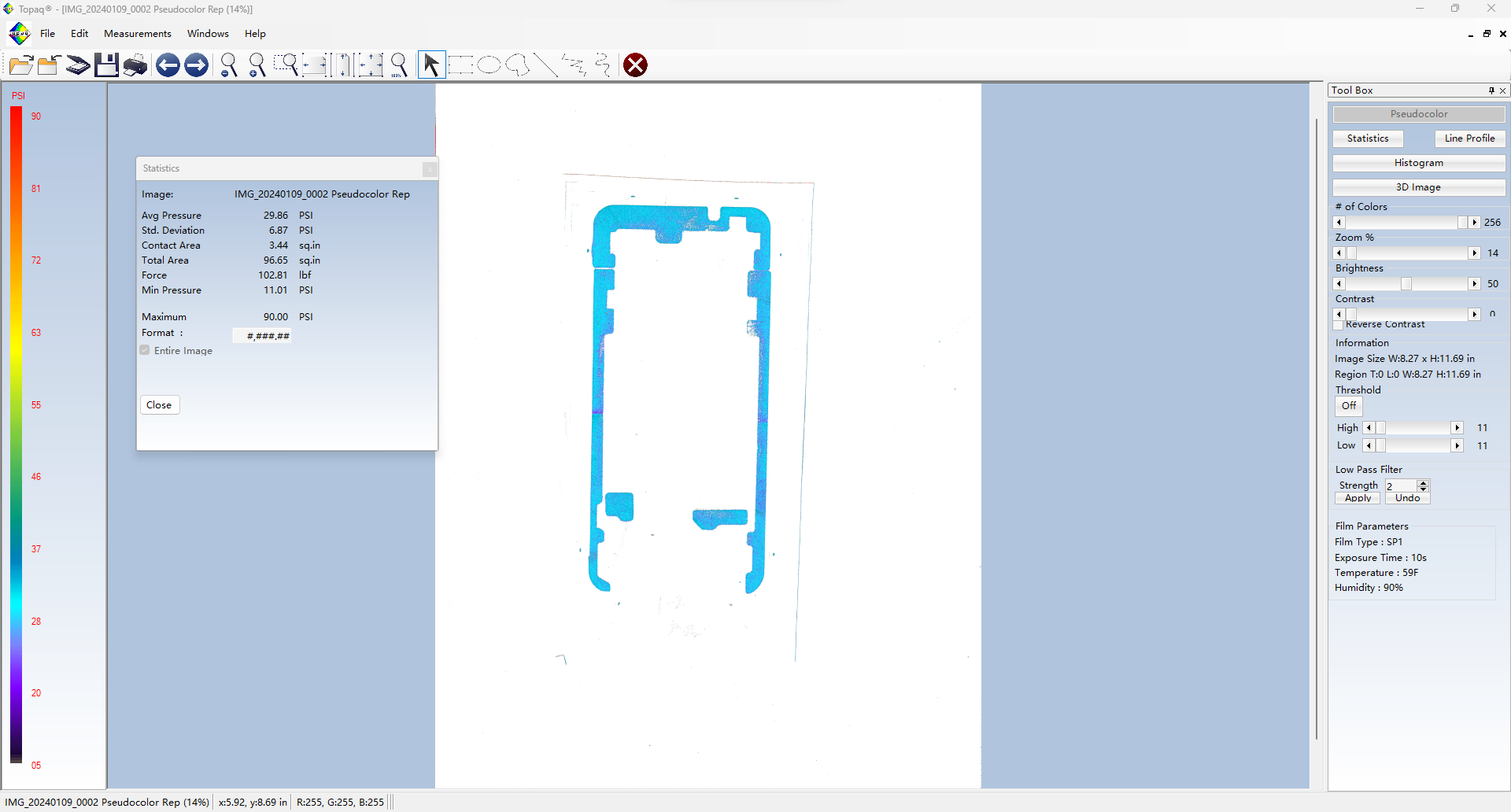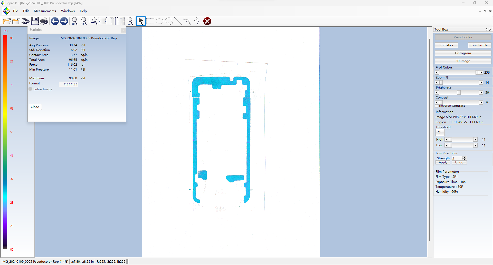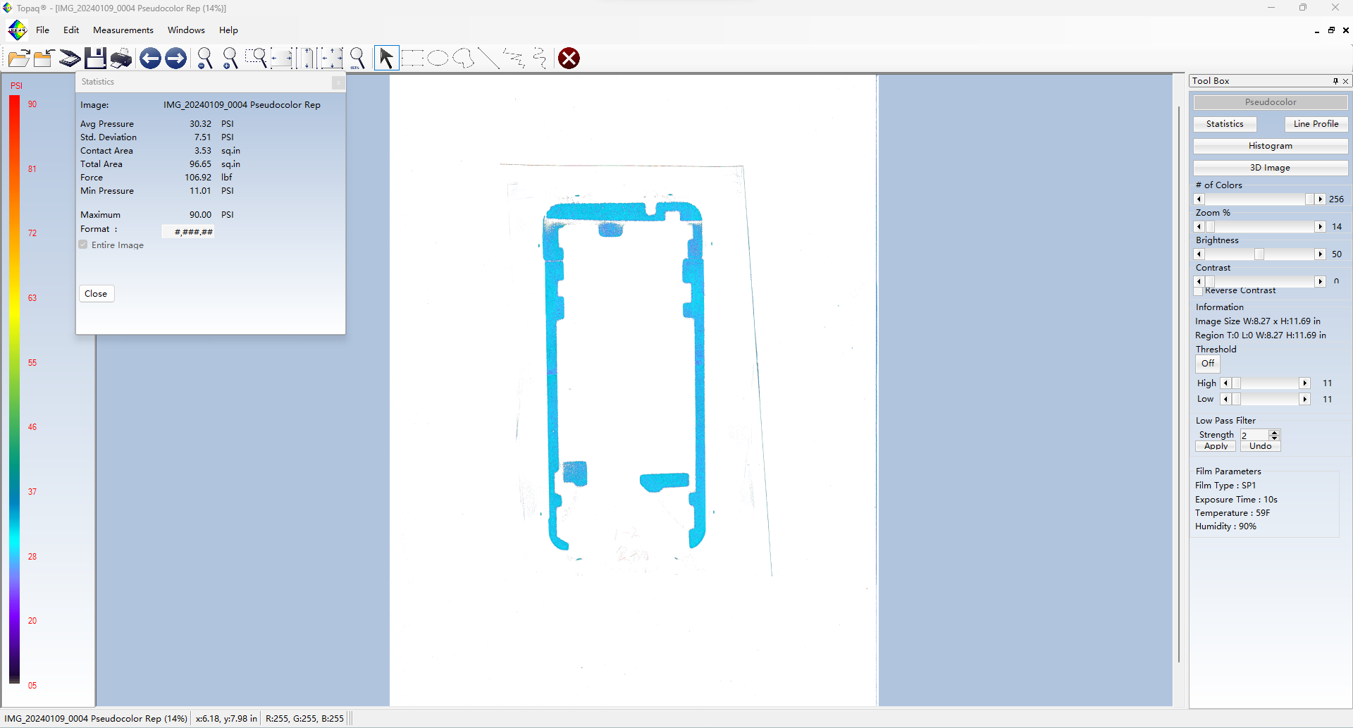 Topaq 感壓紙數據分析系統:由經過特殊校準的密度掃描儀和Windows軟件組成。通過掃描壓敏紙上的圖像可以在軟件里量化成具體的數據值,可以將壓敏紙呈現的圖像轉換成3維圖像。并可以根據色階區分力值大小。